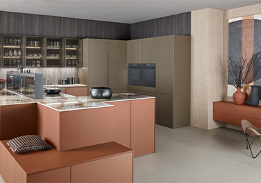 The combination of Fronts in caramel and dark oak with a Decor worktop in travertine creates a harmonious, natural overall appearance. Metal bow handles in copper look and a Clear design language give the kitchen a high-quality look - modern, timeless and inviting at the same time. A statement for well thought-out design and the aspiration to make every room a home.