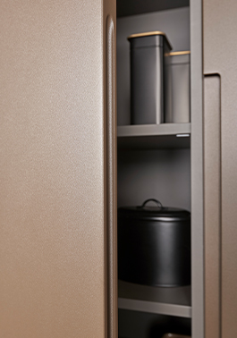 With the soft colour tone Blush, the filigree 12 mm compact worktop VICOSA and elegantly rounded side panels, Bauform presents a kitchen full of lightness and style. The demand for perfection is also evident inside: All fittings and hinges are standard in dark look a harmonious detail that rounds off the elegant overall look.