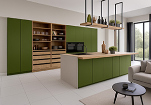 Neben wohnlichen Neutraltönen setzen ausdrucksstarke Farben Akzente: Tiefblau, Schwarzgrün oder Petrol verleihen Tiefe und Persönlichkeit. In Kombination mit goldfarbenen Griffen, hellen Arbeitsflächen und punktueller Beleuchtung entstehen Küchenräume mit Charakter – modern, selbstbewusst, stilbildend.